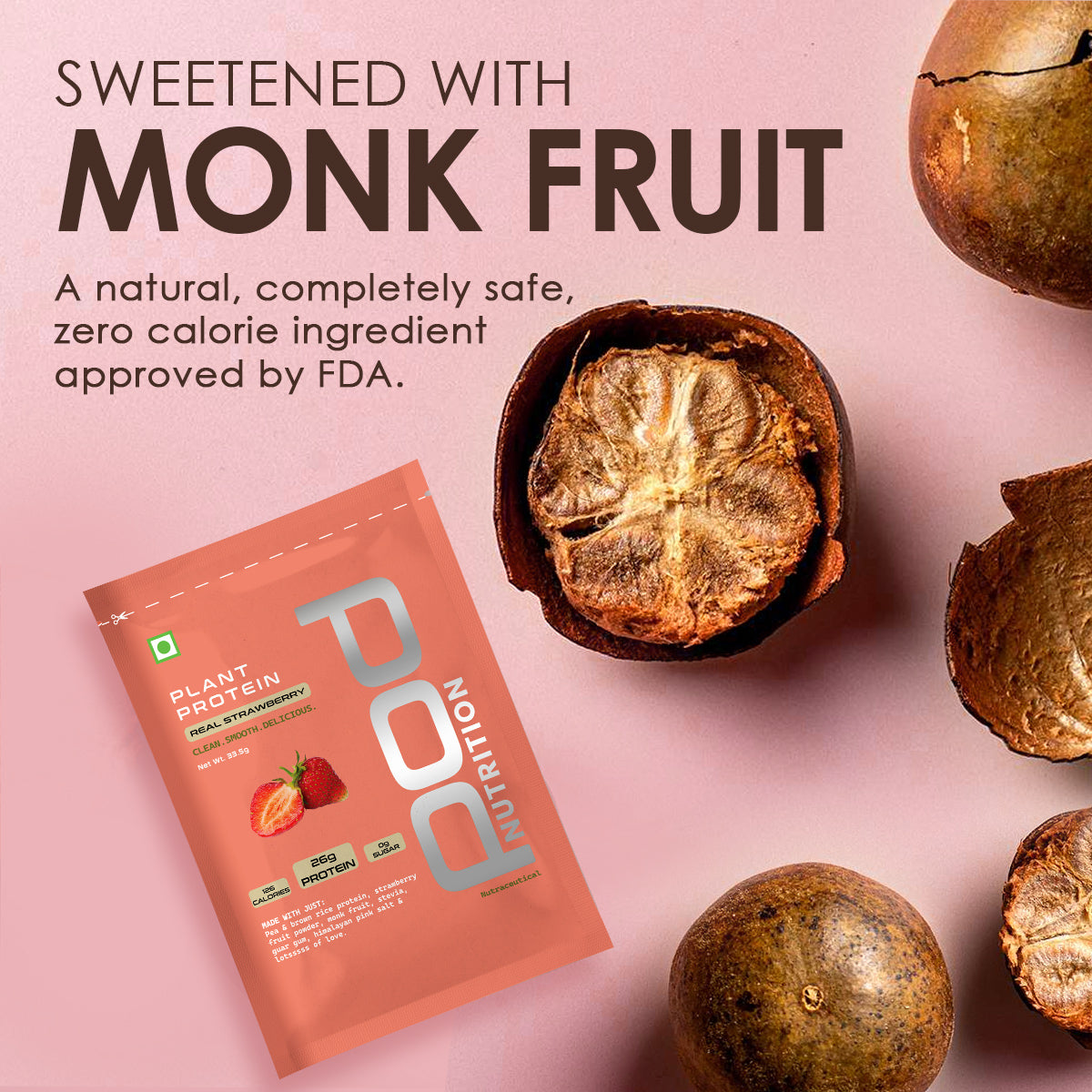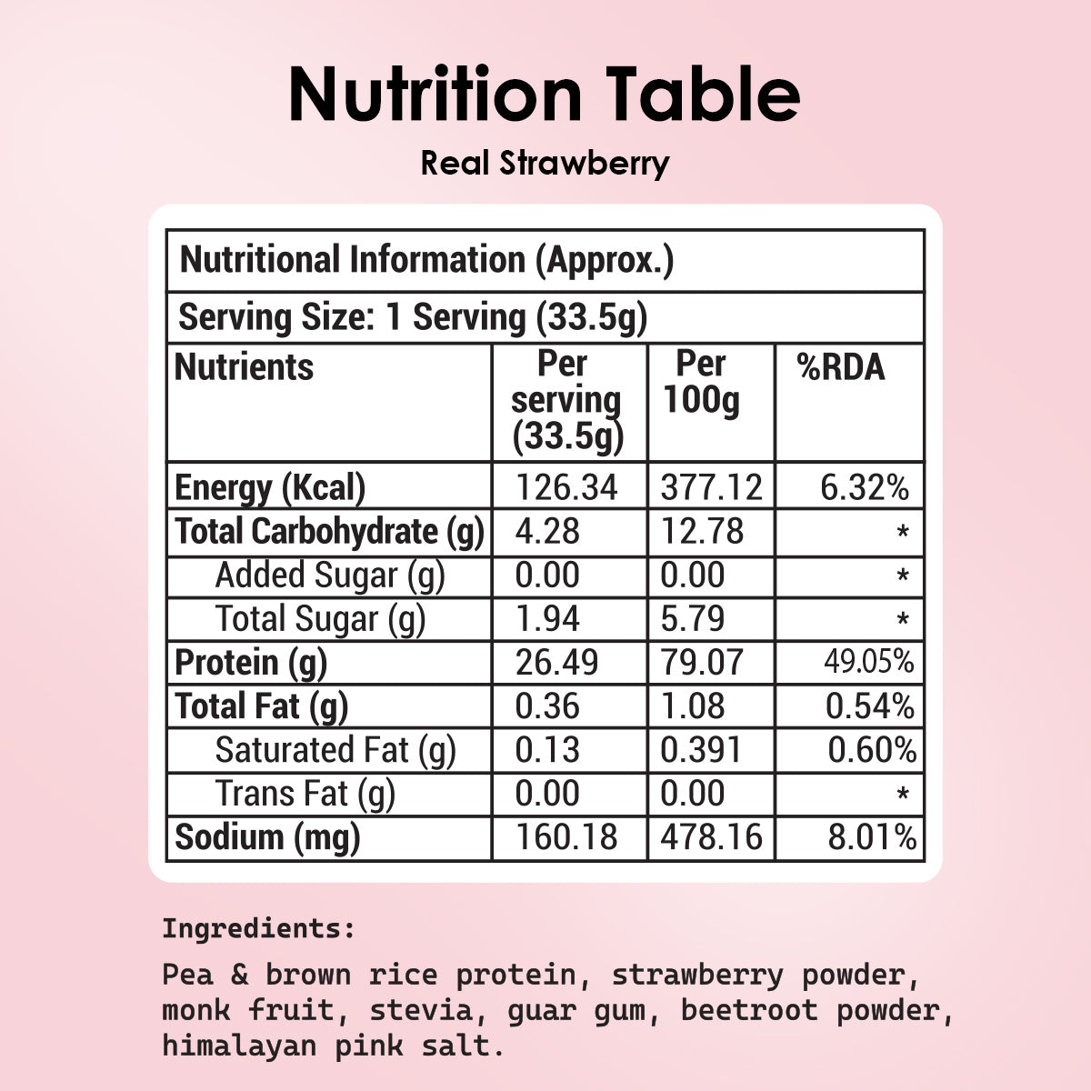 - Signature Protein Blend (Pea Protein Isolate, Brown Rice Protein Isolate), Strawberry fruit powder, Stevia, Monk Fruit Powder, Guar gum & Himalayan Pink Salt.